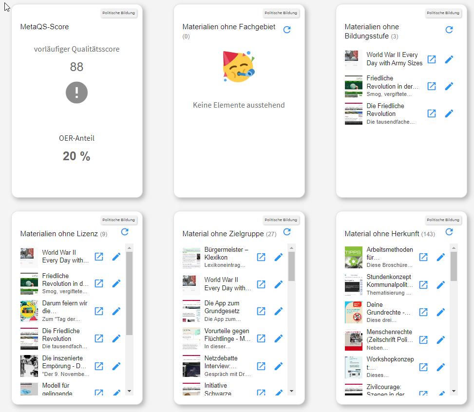 Die Kacheln enthalten Aufgaben für die Verbesserung der Metadaten von Inhalten und für die gewählte Redaktion. Die Übersicht soll spielerisch helfen, die Metadaten zu füllen. Ist ein Metadatum bei allen Inhalten des Fachportals hinterlegt, freut sich der Smiley 🥳, freuen wir uns und natürlich die Community.