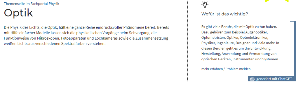 Für solche Fragen erproben wir gerade unser neues Feature “Berufsempfehlungen” passend zur jeweiligen Themenseite. Auch hier kommt wieder KI ins Spiel. Mit Hilfe eines passenden Prompts stellt uns die KI in Windeseile die passenden Berufe zu einem Thema zusammen.
