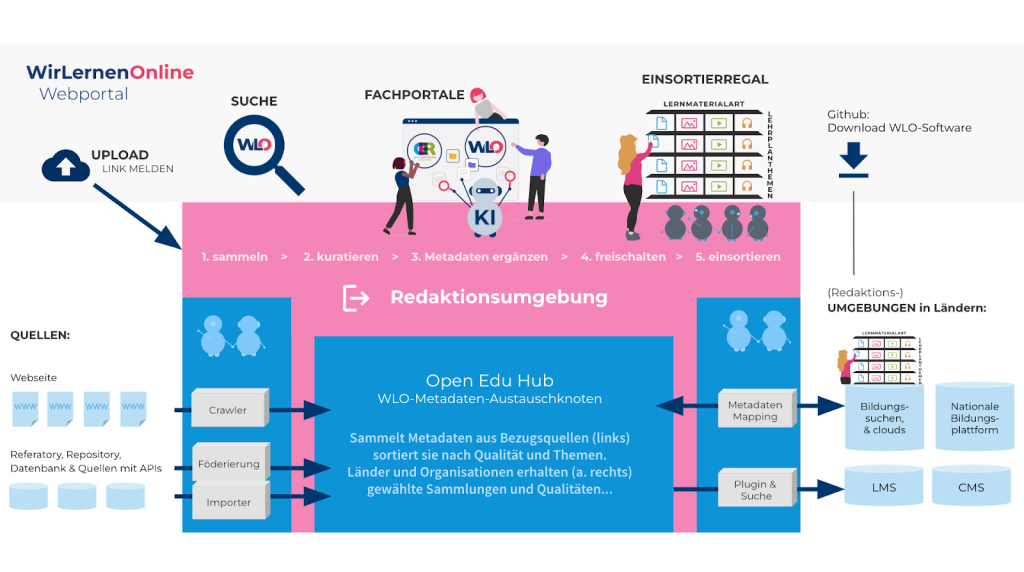 Im technischen Raum von WirLernenOnline.de können Bildungsmaterialien im großen Meer der Inhalte gesammelt & auf Qualität geprüft werden. Außerdem werden sie so aufbereitet, dass sie in vielen Systemen gut genutzt werden können (technische Interoperabilität).