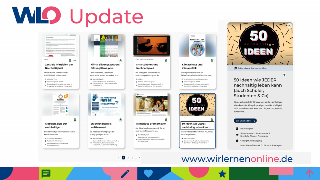 Eine nette Vorschau zu den Suchergebnissen gefällig? Unser UX-Team hat sich gemeinsam mit dem Maschinenraum und der Designabteilung eine komfortable Lösung ausgedacht, um die WLO-Suchergebnisse in einem noch schöneren Gewand erscheinen zu lassen. Geht auf unsere Suche und sucht nach eurem Lieblingsthema. Die gefundenen Inhalte können angeklickt werden und es öffnet sich eine Seitenleiste mit einer Vorschau zu dem jeweils ausgewählten Inhalt. So könnt ihr noch besser filtern, welcher Inhalt wirklich zu eurer Suchanfrage passt, bevor ihr dorthin weitergeleitet werdet. Schaut rein und probiert es aus.