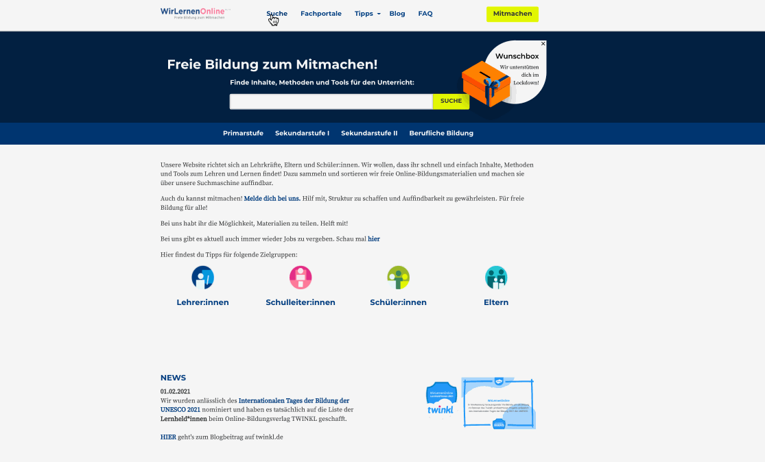 Das Herzstück von WirLernenOnline ist unsere Datenbank mit inzwischen über 150.000 Einträgen. Du findest hier Materialien in unterschiedlichen medialen Formaten, Beschreibungen zu Tools oder auch weiternutzbare Ideen für den Unterricht.