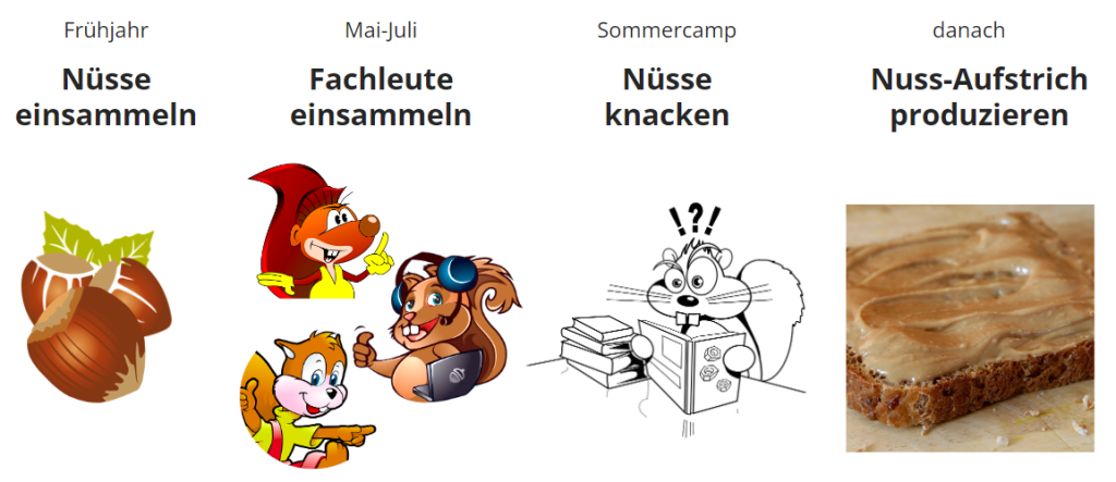 Was beschäftigt die Bildungsakteur*innen derzeit? Dazu führt das Kommunikationsteam z.B. Webinare mit unseren Stakeholdern durch, bei denen die aktuellen Themen an denen wir gerade arbeiten vorgestellt und Feedback dazu eingeholt wird. Was ist spannend, was ist gut und sollte weiterentwickelt werden? Also was sind die Nüsse, die geknackt werden sollen? Diese nehmen wir dann auf und legen sie beim Sommercamp auf das “Themenbuffet“.