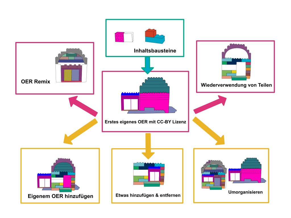 Hat man einmal passende und hilfreiche OER-Inhalte gefunden, stellt sich die Frage, was es bei der Verwendung und Nachnutzung des Inhalts zu beachten gilt. Vielleicht möchtet ihr das gefundene Material den eigenen Erfordernissen entsprechend anpassen oder bearbeiten? Die gute Nachricht: OER-Inhalte können je nach Lizenz kombiniert, remixt und bearbeitet werden. In welchen Fällen das ohne Bedenken geht – dazu nachfolgend Absprünge zu hilfreichen Seiten!