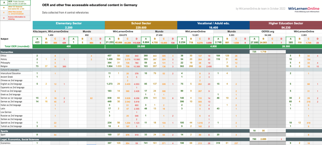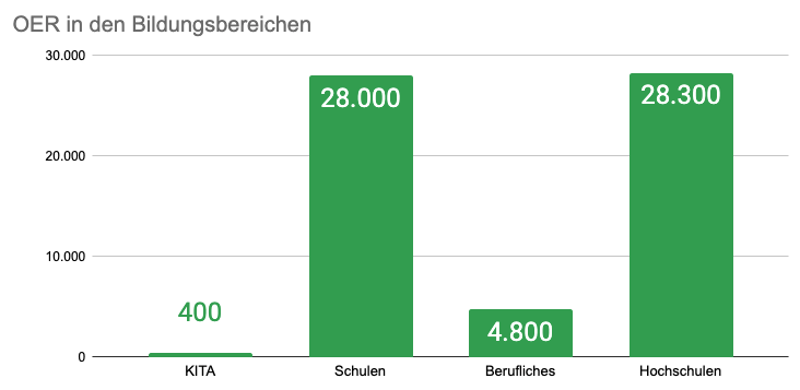 - OERSI.org – erfasst OER für den Hochschulbereich, der aus ersten Landessammelstellen gespeist wird. Verwiesen sind 55.376 Inhalte unter OER und anderen CC-Lizenzen. Die Grafik zählt nur OER.