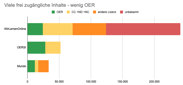 - Mundo.schule startete sein Angebot für den Schulbereich im Herbst nach Beginn der Corona-Pandemie. Bisher sind ca. 49.579 Inhalte verwiesen, davon 11.633 OER. WirLernenOnline und Mundo haben schätzungsweise nur 10% Überlappung im Bestand, die in der obigen Gesamtschätzung herausgerechnet wurden.
