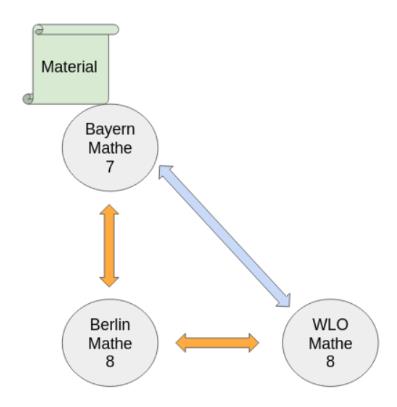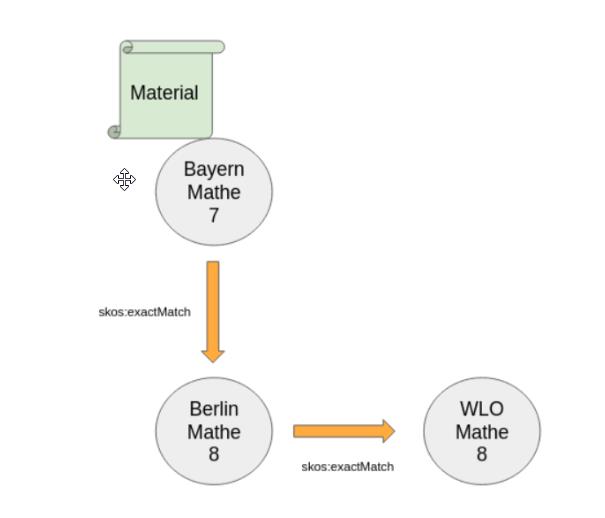 Ziel: Eine Lehrerin ordnet im bayerischen Lehrplan ein Material einem âThema Aâ zu. Nun wird âThema Aâ aus Bayern mit âThema Bâ aus Berlin verknĂŒpft. AuĂerdem wird âThema Câ des WLO-ThemenbaumsÂł mit dem âThema Bâ aus Berlin verknĂŒpft. Nun soll das Material, das lediglich dem bayerischen Lehrplanthema zugeordnet wurde, auch auffindbar werden, wenn in dem WLO-Themenbaum oder dem Berliner Lehrplan gesucht wird.