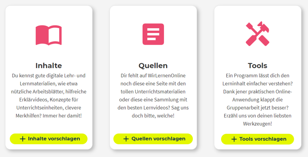 - Nun erhältst du verschiedene Optionen. Möchtest du einen Inhalt, eine ganze Quelle oder ein Tool vorschlagen? Wähle die passende Option aus. In der Regel werden “Inhalte” (z.B. Arbeitsblatt, interaktive Übung) vorgeschlagen.