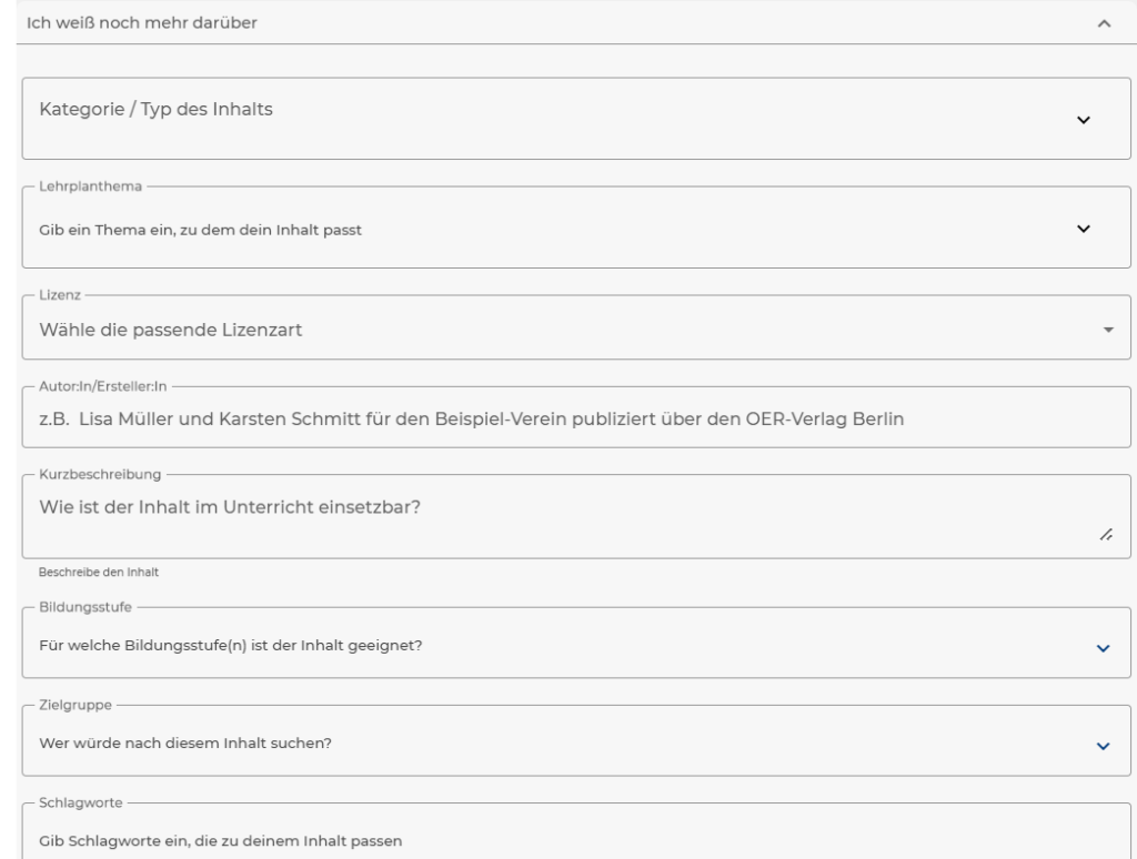 - Du weißt noch mehr über dein Material? Dann klappe einfach das Feld “Ich weiß noch mehr darüber” auf. Je mehr du angibst, desto besser! Denn wir brauchen so viele Metadaten wie möglich. Metadaten sind Daten über Daten und dienen dazu, dass deine Materialien nachher in unserer Suchmaschine oder in unseren Fachportalen leichter aufzufinden sind. Über bestimmte Filter wie den Typ des Inhalts (z.B. Arbeitsblatt) oder die Bildungsstufe (z.B. Primarstufe) und beschreibende Schlagwörter kann dein Material viel besser gefunden werden.