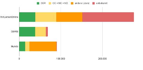 - OERSI.org – erfasst OER für den Hochschulbereich, der aus ersten Landessammelstellen gespeist wird. Verwiesen sind 68.598 Inhalte unter OER und anderen CC-Lizenzen. Die Grafik zählt nur OER.