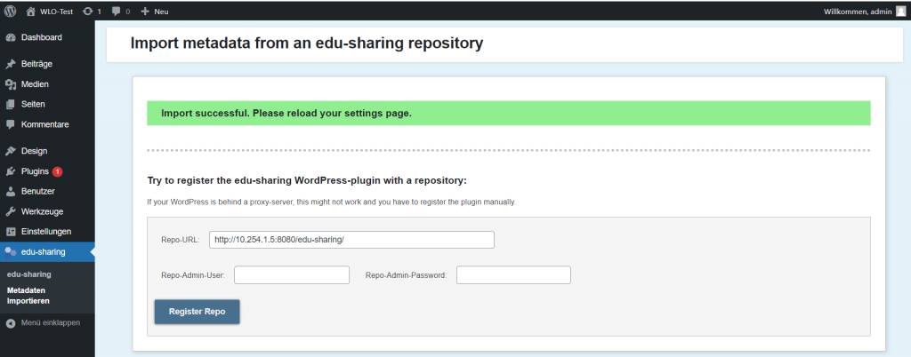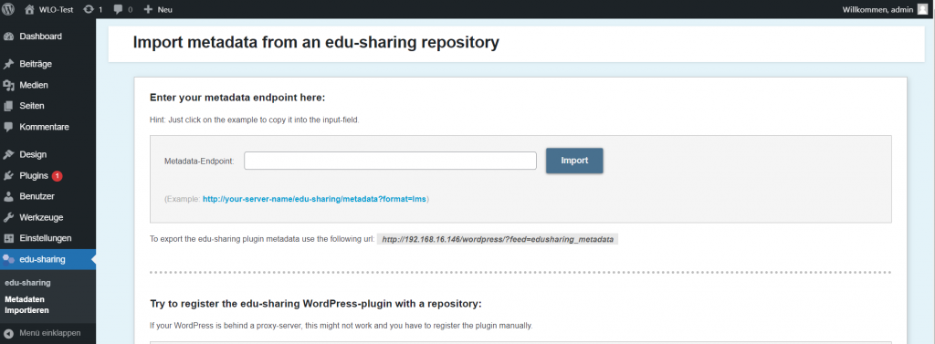 Gehe nun im Hauptmenü auf “edu-sharing/Metadaten importieren”. Merke dir die URL, die nach “To export the edu-sharing plugin metadata use the following url:” (in grau) angegeben wird. Diese URL-Angabe benötigst du später im Kontaktformular.