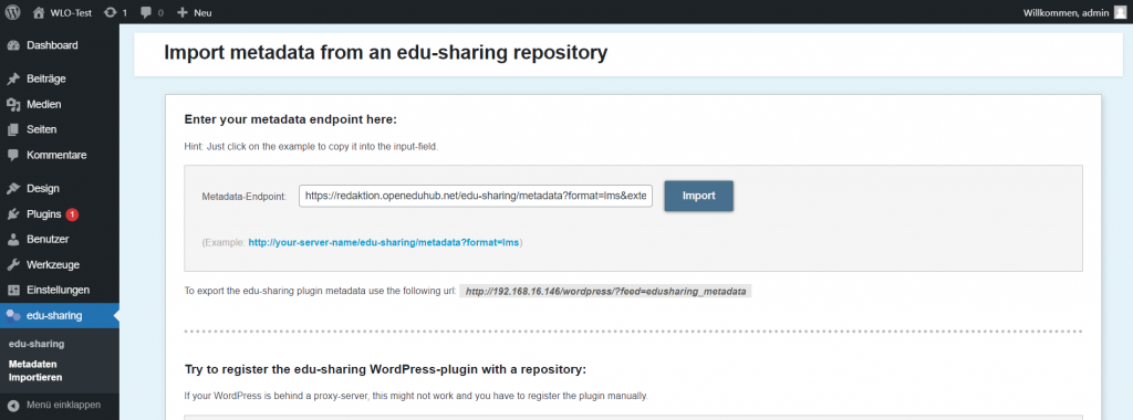 Gebe als Metadaten-Endpoint diese URL https://redaktion.openeduhub.net/edu-sharing/metadata?format=lms&external=true ein und klicke auf “Import”.