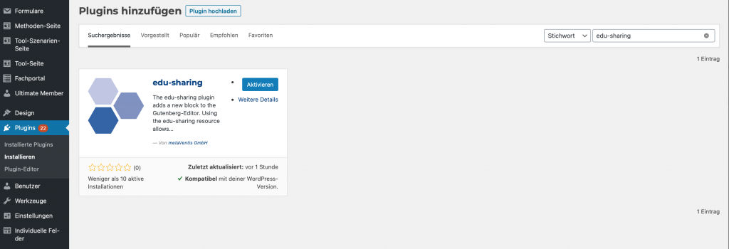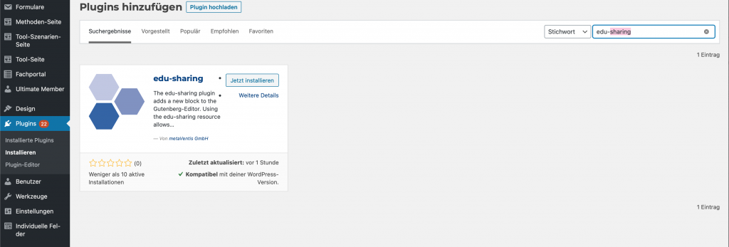 Gebe “edu-sharing” in das Suchfeld ein und klicke dann auf “Jetzt installieren”.